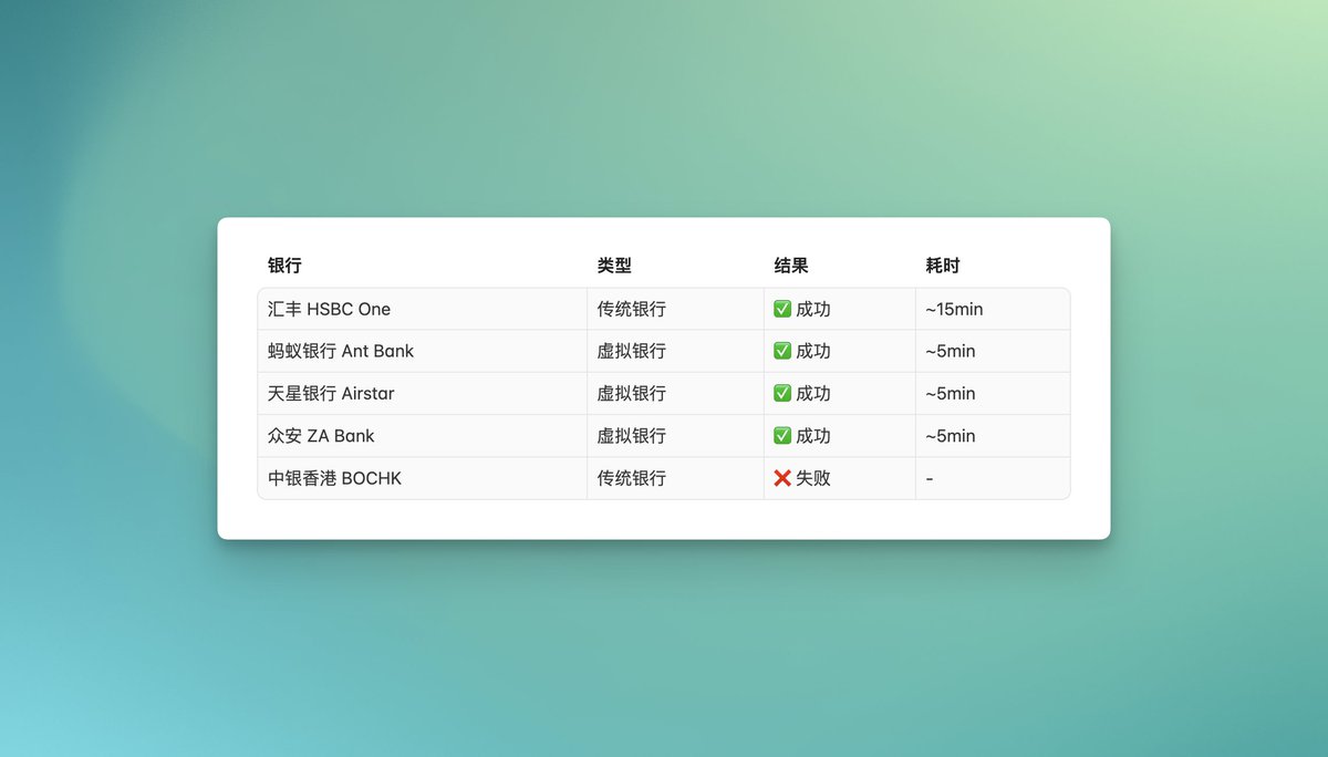 去了趟香港,开了四张银行卡,全程不到一小时。没去柜台,没排队,酒店WiFi + 手机App一顿操作就完事了。