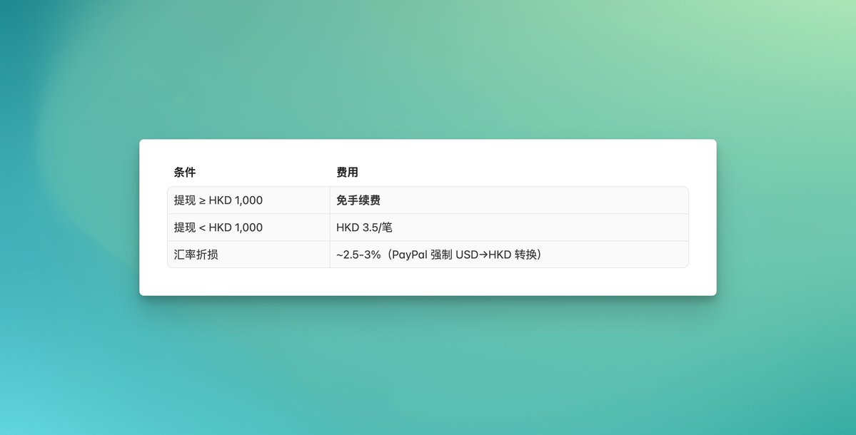 真正的成本不在手续费,而在 PayPal 的汇率加价(约 2.5-3%)。PayPal 会强制把 USD 转成 HKD,即使汇丰支持多币种账户也无法避免。对于小额海外收入来说,这个损耗可以接受。