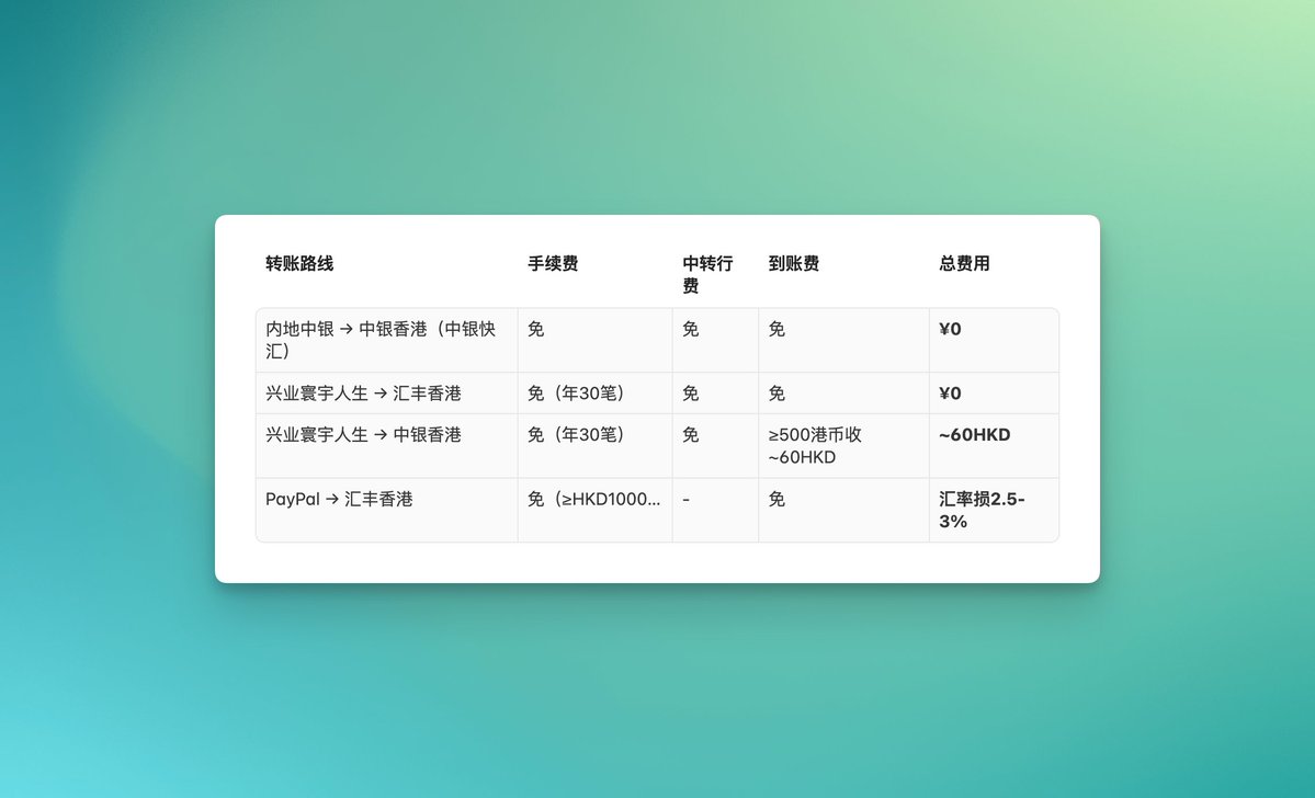 背景:中国银行的香港分支。最大优势是国内中银与中银香港同名互转零手续费(通过「中银快汇」)。另外,内地兴业银行寰宇人生卡也可以转中银香港,兴业端免手续费,但中银香港可能收约 HK$60 的到账费(500港币以上),所以走中银快汇才是真正零费用。