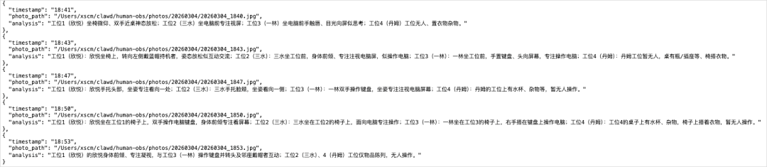 每隔2~5分钟就截一张图,通过OpenClaw喂给一个多模态模型,让它像写日记一样描述看到了什么。