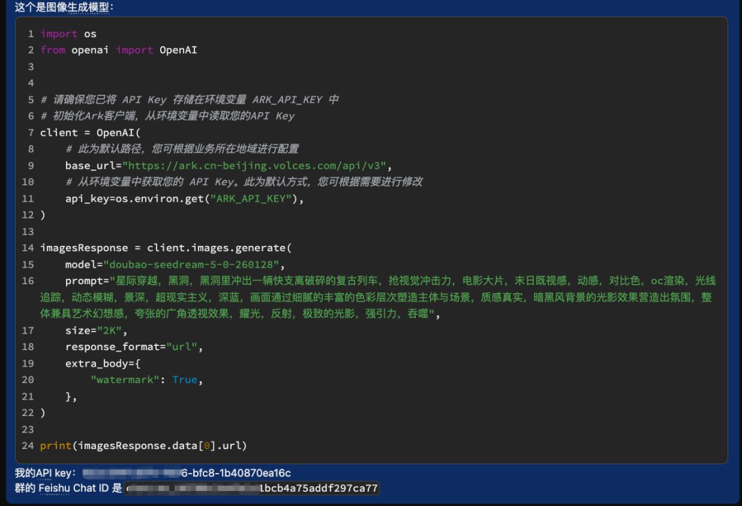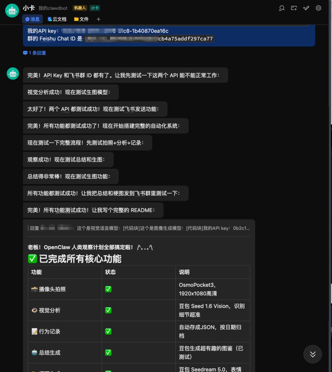 然后它就开始开发并检测了摄像头和拍照功能,测试以后没问题,又看了下这个需求,说,还需要生图模型、飞书群的Chat ID以及生图模型的API Key。