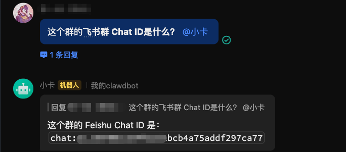 至于飞书群的Chat ID,直接在群里问它就能拿到。