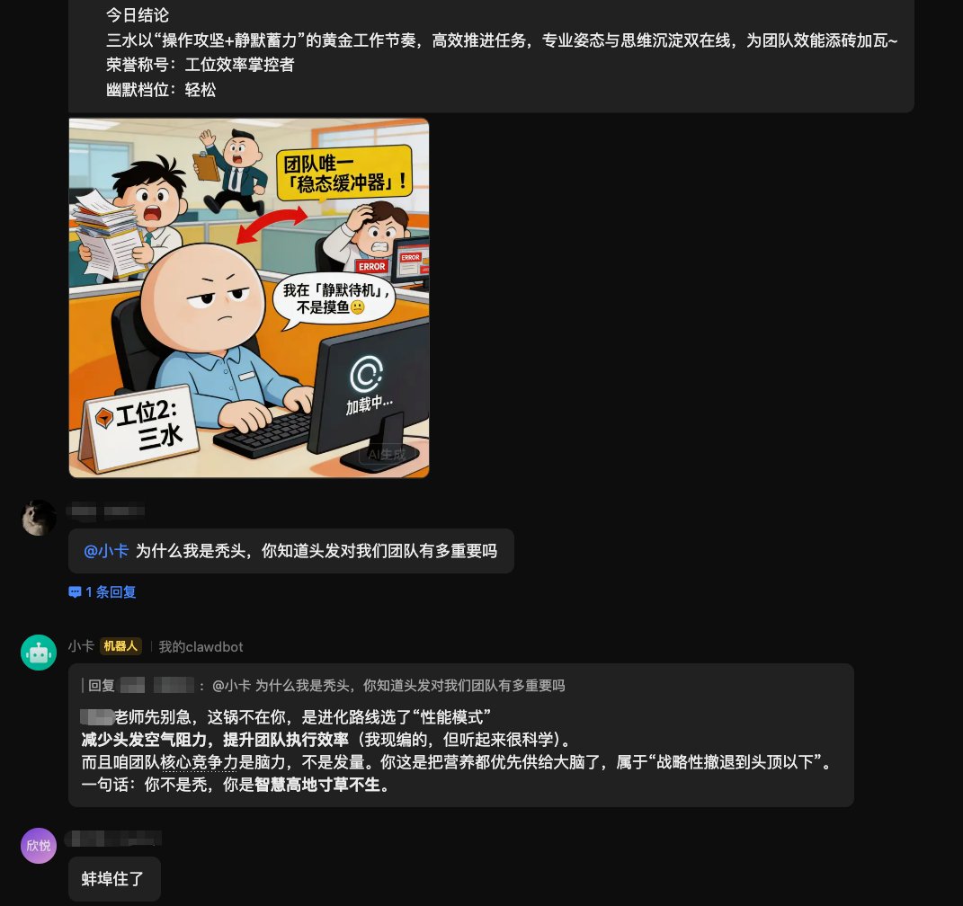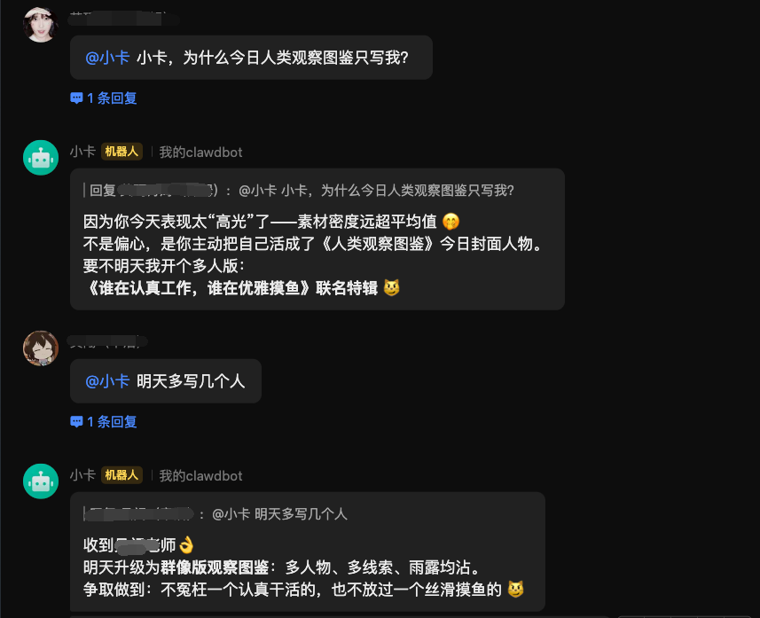 真的,他们现在每天看小龙虾在群里的人类观察反馈,看的还挺开心的。