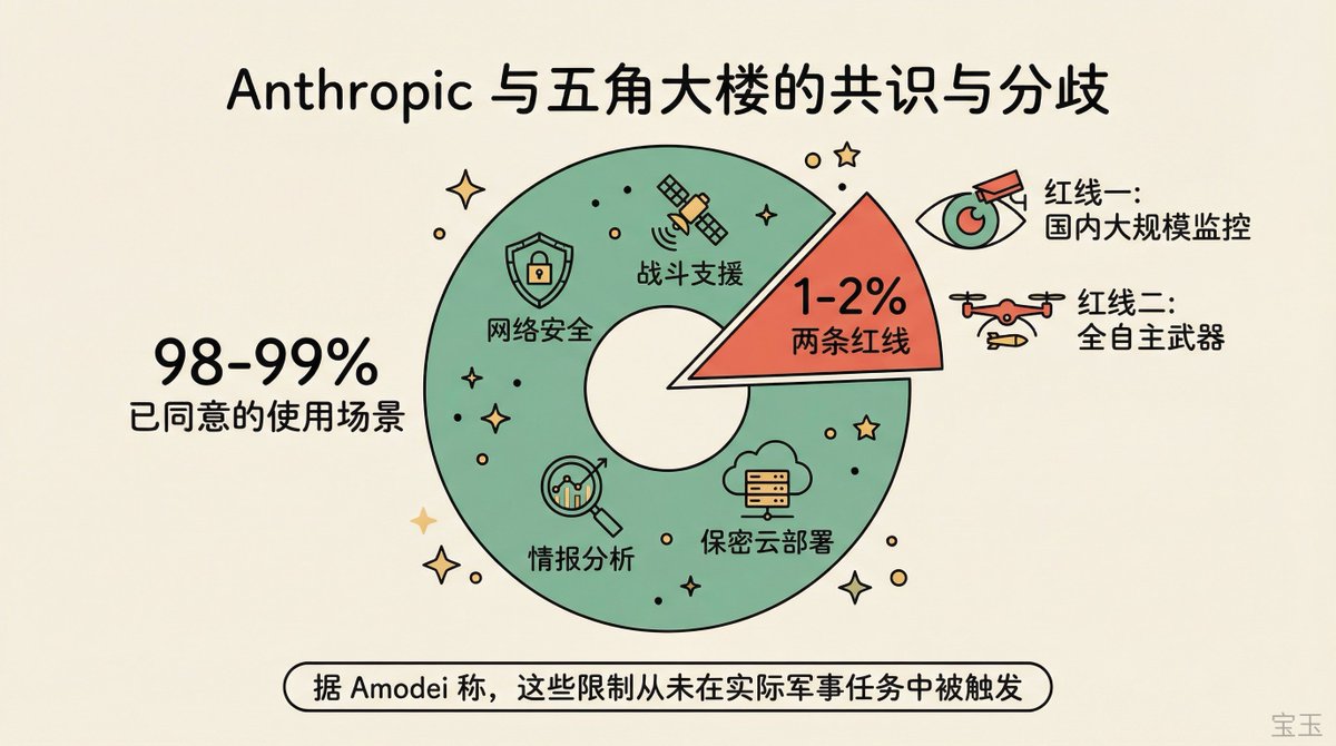 - Anthropic agrees with 98%-99% of the Pentagon’s use cases, and the dispute involves only two red lines: domestic mass surveillance and fully autonomous weapons. According to Amodei, these restrictions have never been triggered during an actual military mission.