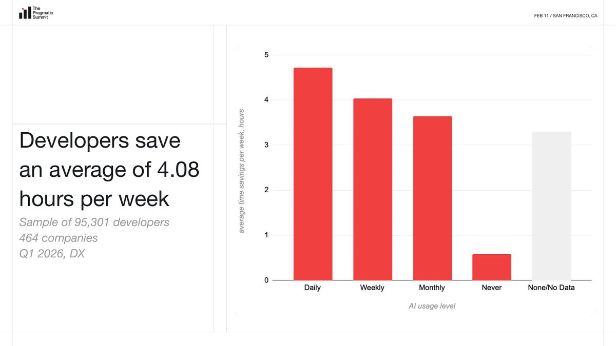 Then look at the time savings. In a sample of 95,301 developers, self-reported savings of approximately 4.08 hours per week due to AI tools. Broken down by frequency of use, those who used daily saw the most savings (about 4.8 hours/week), those who used weekly about 4 hours, and those who used monthly about 3.6 hours. This number is similar to Q2 in 2025, and close to Q4’s 3.67 hours, which has been hovering around 4 hours. A study published by Google in 2025 claimed about a 10% productivity improvement, and DX’s data basically confirms this magnitude.