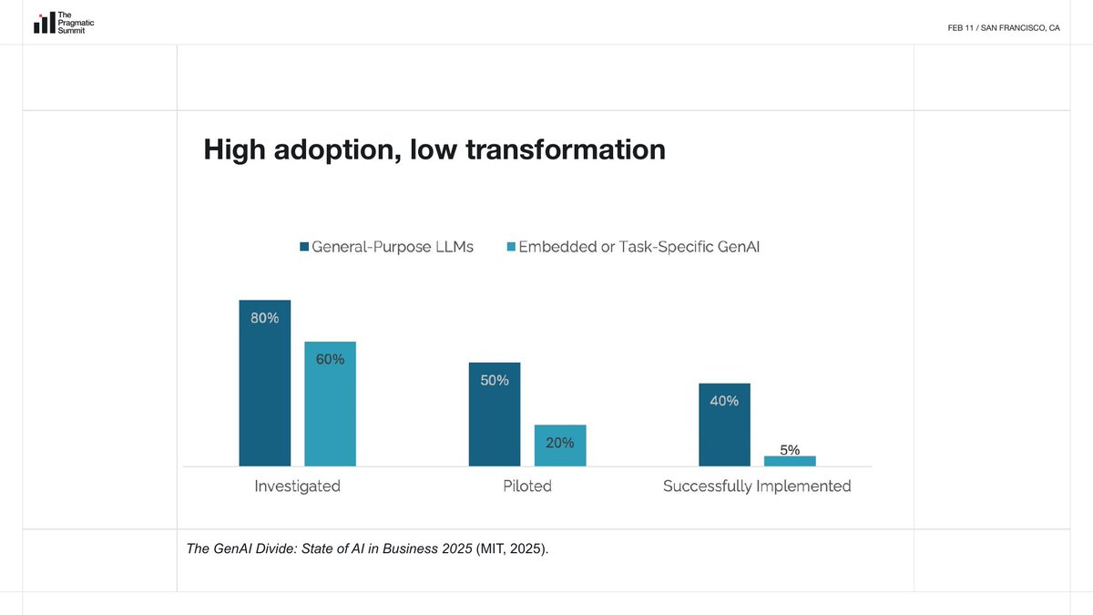 The chart on the PPT shows: 80% of organizations have investigated the general large language model, but only 50% have entered the pilot stage, and only 40% have successfully implemented it. Embedded or task-specific GenAI is even worse, with an extremely steep funnel from 60% research to 20% pilot to 5% successful implementation. There are plenty of stragglers every step of the way, from pilot to production to profit.