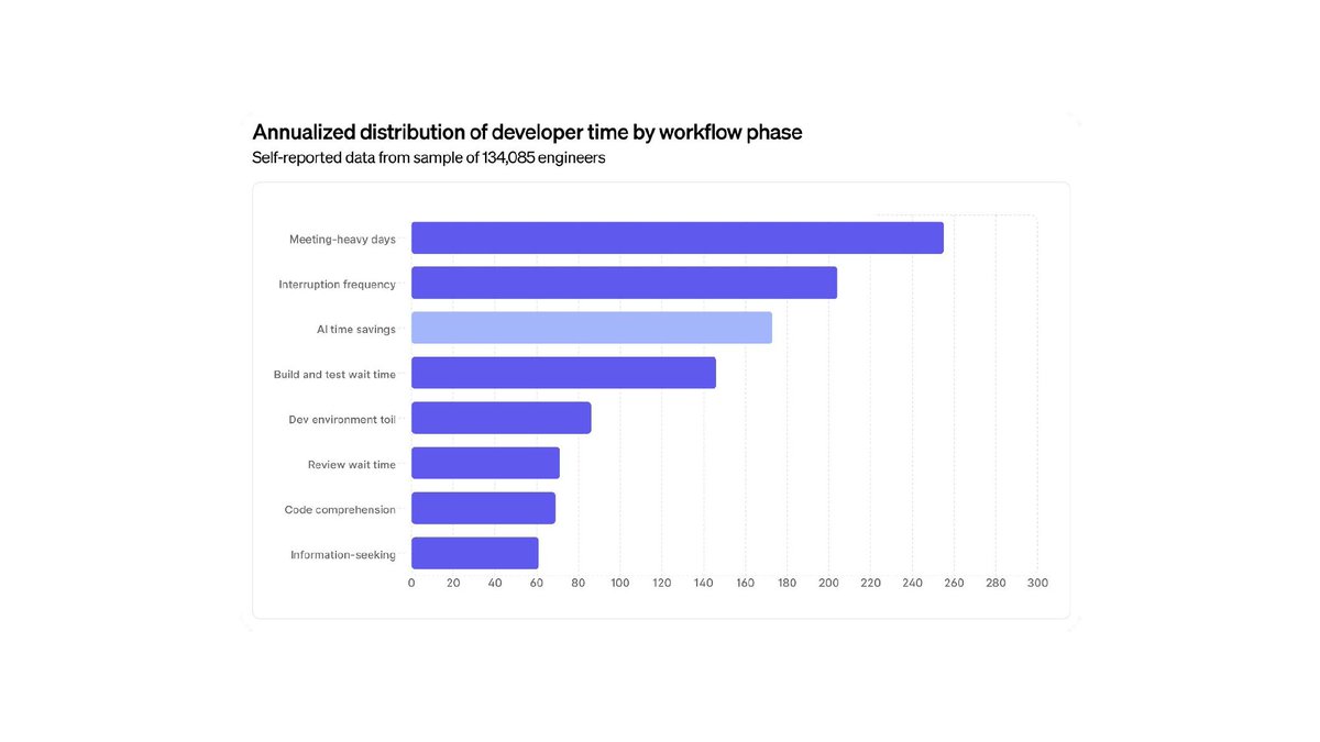 The PPT shows a chart from a survey of 134,085 engineers, arranging the impact of each workflow stage on developer time by annualized time distribution. At the top of the list were “meeting-intensive days” and “frequency of interruptions,” far ahead of “AI time savings.” Build and test wait times, development environment complexity, review wait times, code understanding, and information search ranked lower.