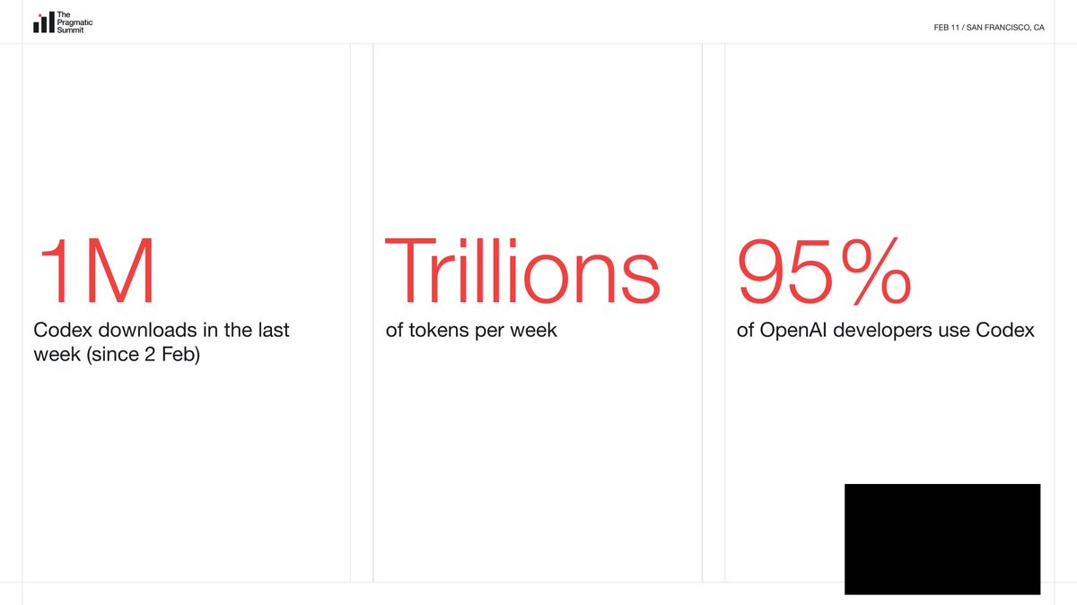 Regarding Codex, Laura shared a set of data: Codex desktop version exceeded 1 million downloads within a week of its release on February 2, and user growth increased by 60% last week. OpenAI processes trillions of tokens internally every week, and 95% of OpenAI developers are using Codex. The GPT 5.3 Codex was also released last Thursday (around February 6). Developers using Codex submit approximately 60% more PRs per week than developers using other AI tools.
