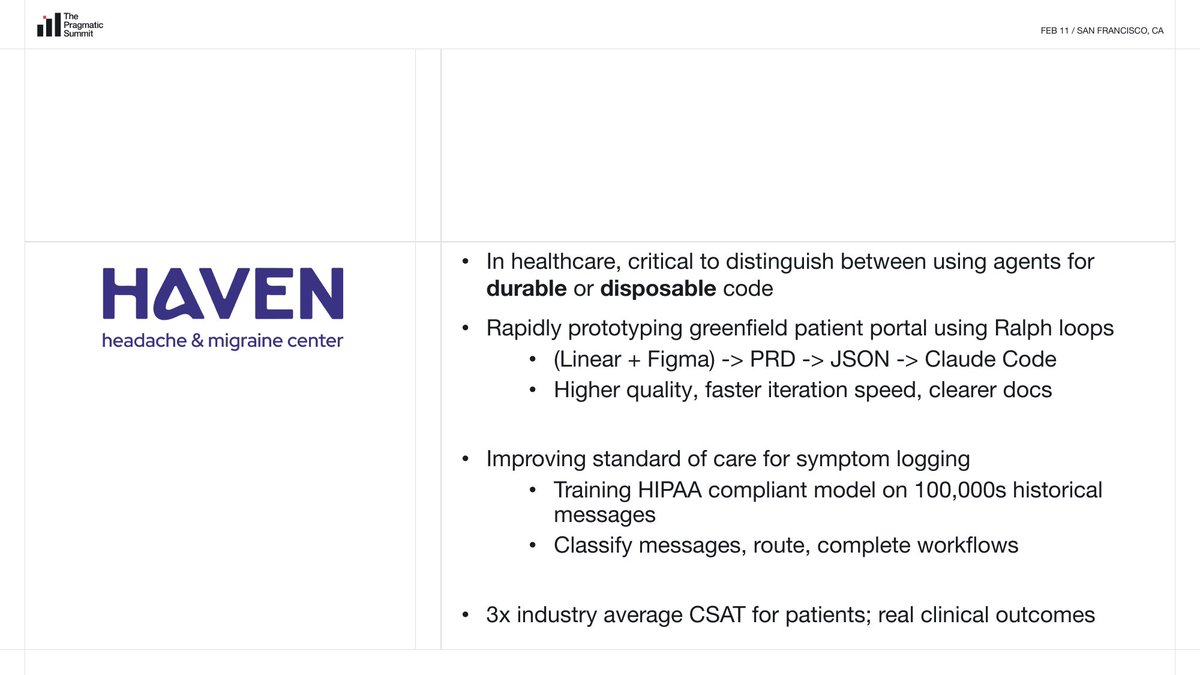 On the development side, Haven used Ralph loops to quickly prototype a new patient portal. The PPT shows the complete workflow link: (Linear + Figma) → PRD → JSON → Claude Code. The output is not one-time junk code, but high-quality prototypes, with faster iterations and clearer documentation.