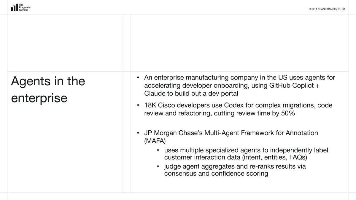 Large companies are also moving. Cisco has 18,000 engineers using Codex every day, primarily for complex code migrations and code reviews, reducing code review time by 50%. JP Morgan Chase published a paper on MAFA (Multi-Agent Framework for Annotation, multi-agent annotation framework): multiple specialized agents independently annotate customer interaction data (intentions, entities, FAQ categories), and then a “judgment agent” aggregates and re-ranks the results through consensus and confidence scoring.