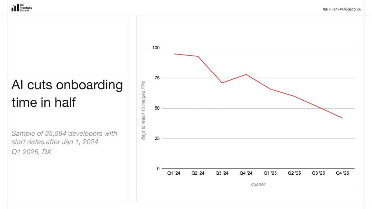 - Onboarding as the Killer App:** The time required for new hires to reach their 10th Pull Request (a key predictor of long-term performance) has been halved, dropping from 100 days to under 50.