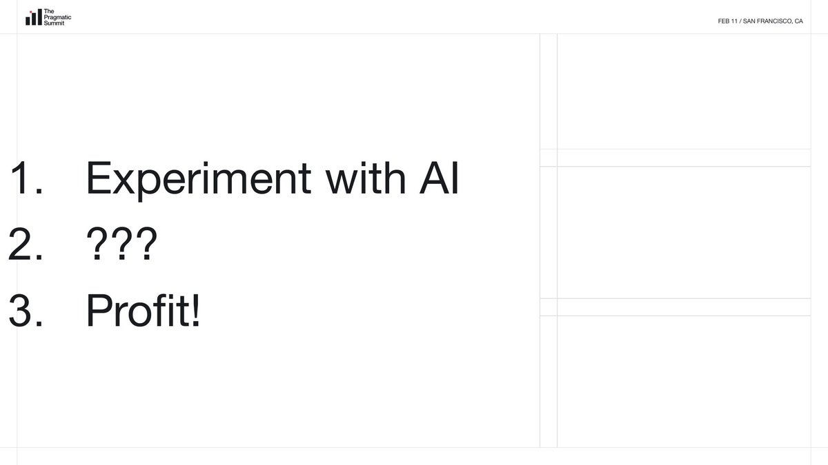 Three steps are listed directly on the PPT: “1. Experiment with AI → 2. ??? → 3. Profit!”. That “???” in the middle is the really hard part, it’s called organizational change management.
