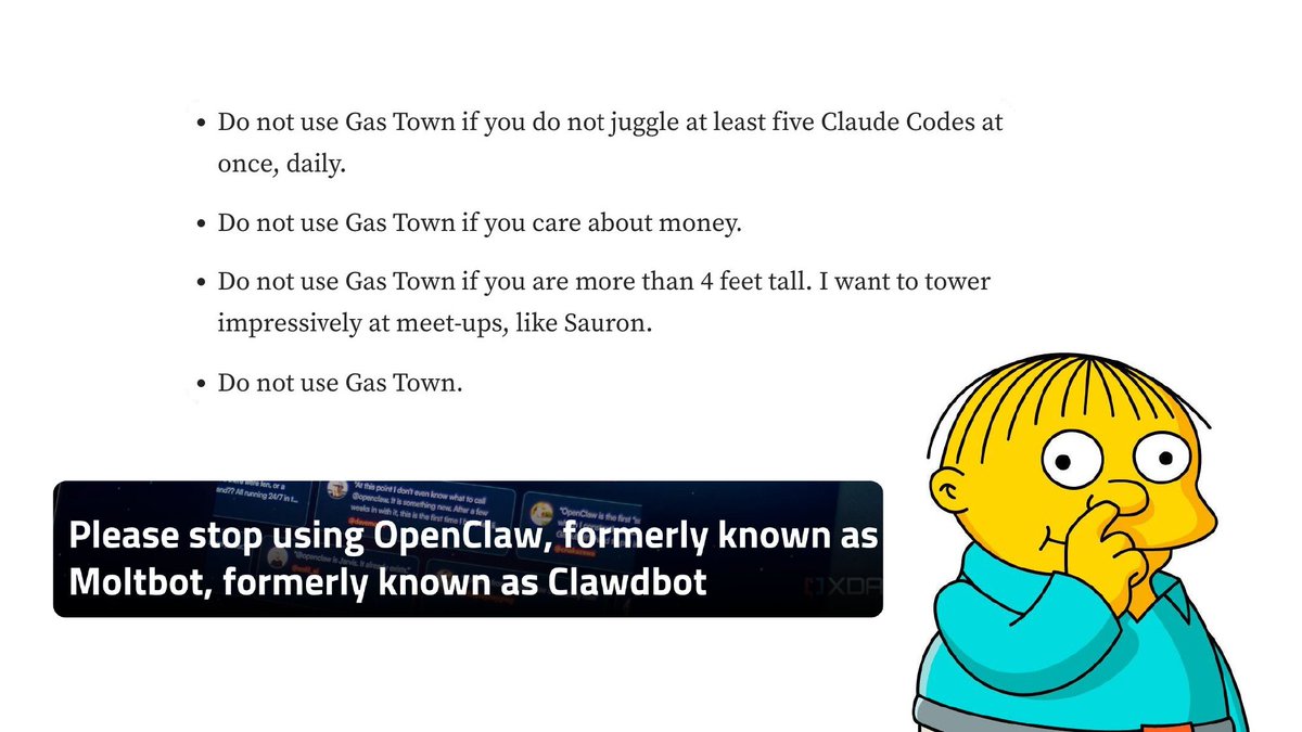 Laura described Gas Town as “completely crazy”, and the PPT listed several usage warnings: “If you can’t run at least 5 Claude Codes at the same time, don’t use Gas Town”, “If you care about money, don’t use Gas Town”, “Don’t use Gas Town”.