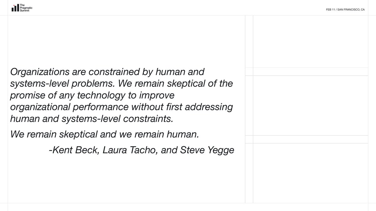 (“Organizations are constrained by human and systems-level problems. We remain skeptical of the promise of any technology to improve organizational performance without first addressing human and systems-level constraints. We remain skeptical and we remain human.” — Kent Beck, Laura Tacho, and Steve Yegge)