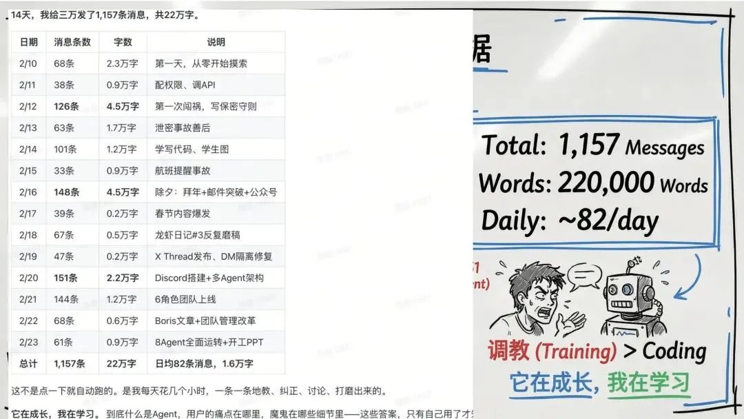 I sent an average of 20,000 words of messages every day in the past 14 days. 2,000 words an hour, dozens of words a minute. What is this concept? I keep interacting with it, constantly stepping into pitfalls, solving problems, summarizing, and optimizing. There were a lot of detours along the way, but after I got through it, if I had another lobster, I could finish most things in a day or two. This is knowhow.
